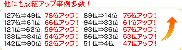 当塾の成績アップの一例です。50番以上成績順位が上がった生徒は全体の30%を超えます。
